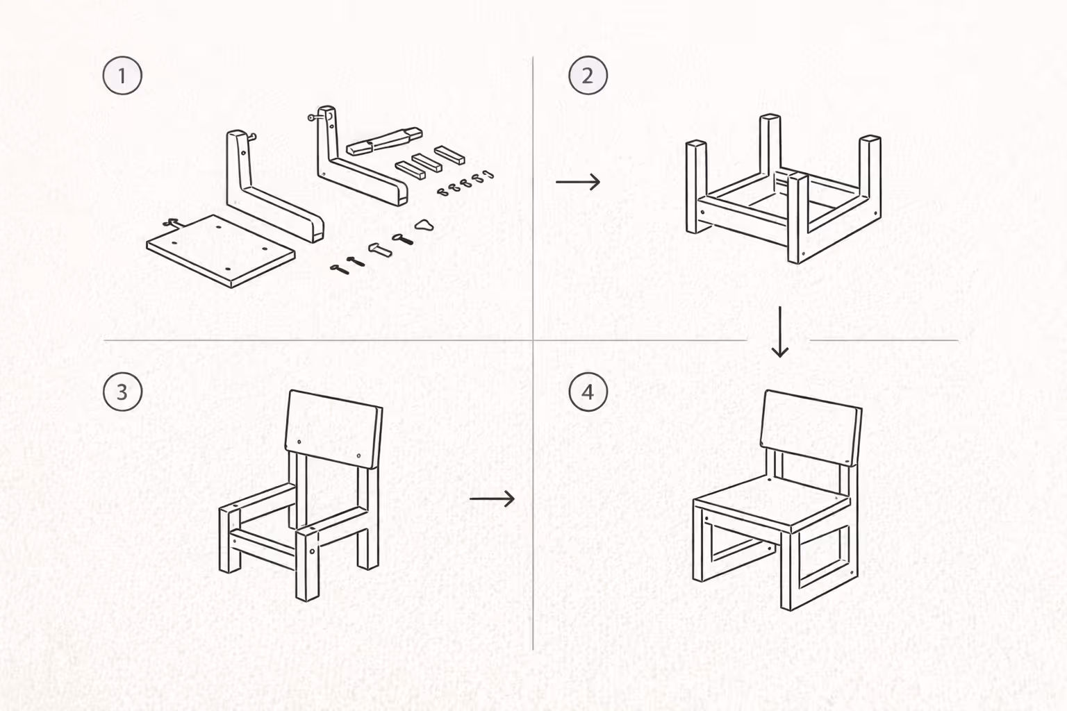 IKEA manuals typically break the build into discrete steps where each step asks for one action: attach this, tighten that, flip the panel, repeat.