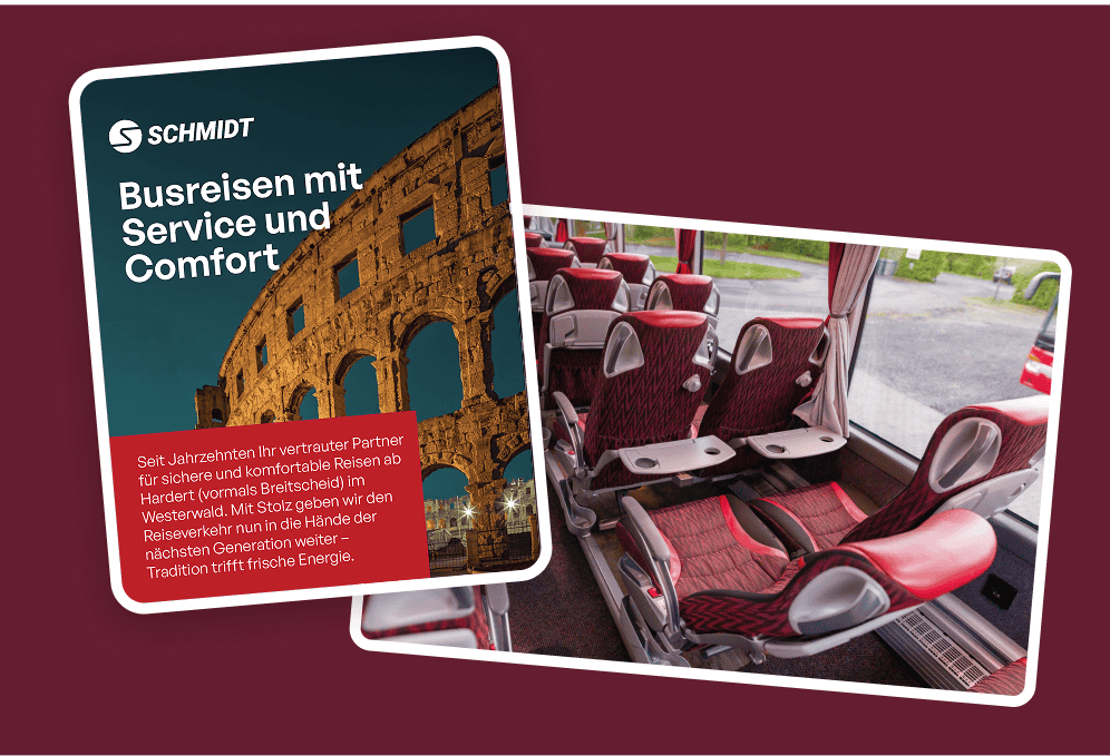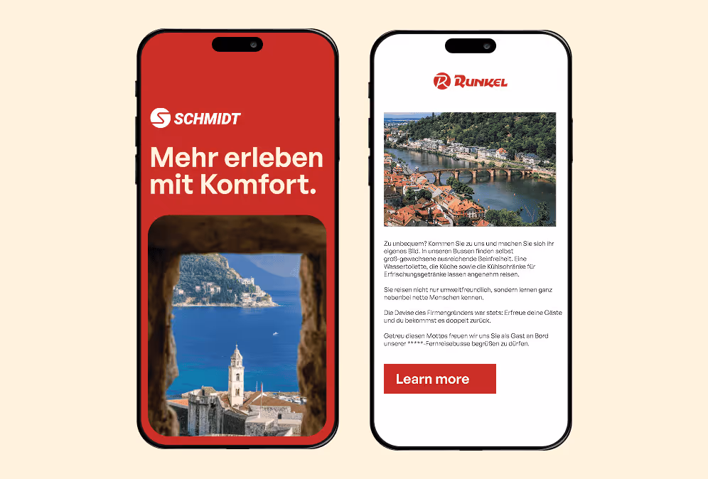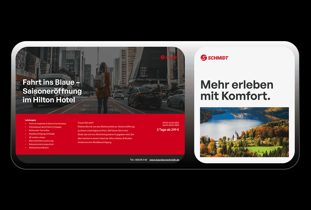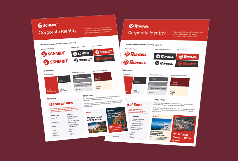Busreisen Schmidt (est. 1956) and Runkel Reisen (est. 1928) came under shared ownership—while still serving two distinct travel tiers. The task wasn’t to flatten those differences. It was to celebrate both legacies and create a fresh, unified face across every touchpoint. We built a dual identity system that makes the choice obvious at a glance: premium comfort vs. smart value—with shared lineage, modern visuals, and consistent application from fleet graphics to social posts.